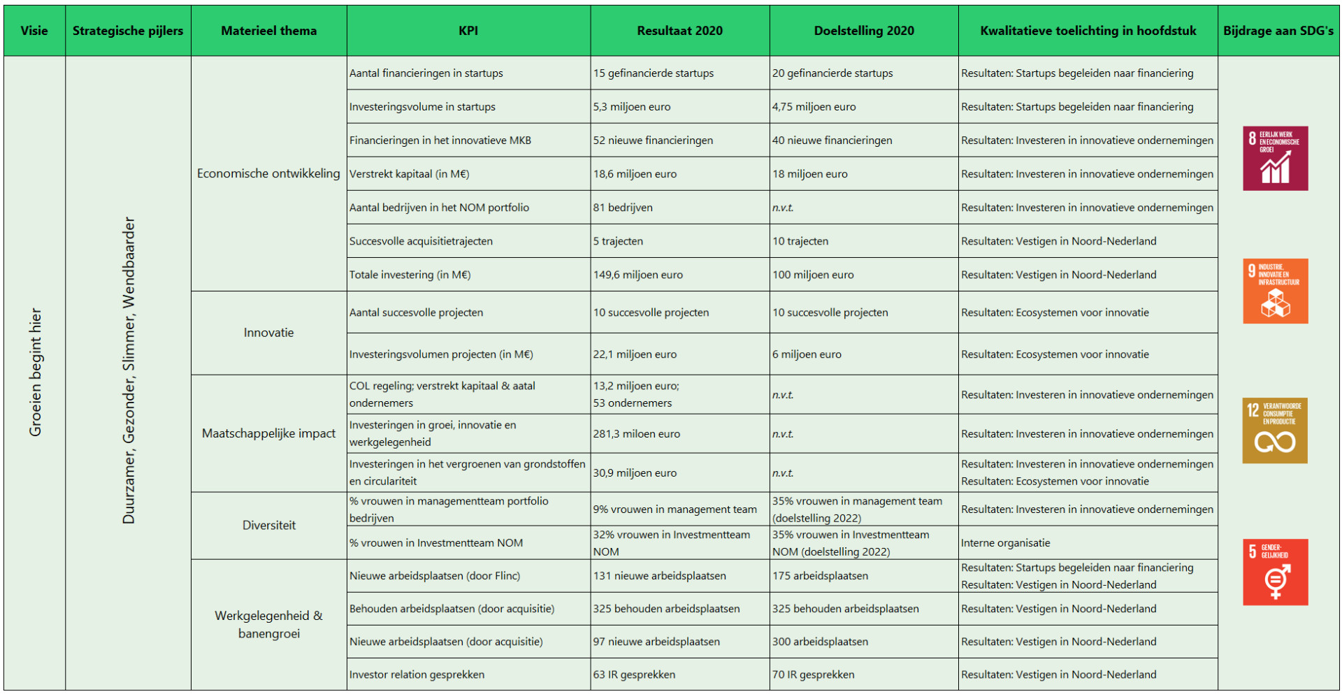 - De prestatie-indicatoren Succesvolle acquisitietrajecten, Totale investeringen en Nieuwe arbeidsplaatsen worden bepaald aan de hand van opgaven door de portfoliobedrijven en confirmation letters van de betreffende ondernemingen. Daarmee verklaren de bedrijven dat zij onder andere door samenwerking met de NOM in de regio hebben geïnvesteerd en arbeidsplaatsen hebben gecreëerd. Er wordt uitgegaan van een tijdspanne van drie jaar. De data worden gedurende het boekjaar verzameld. Prestaties die niet verifieerbaar zijn of waarvan geen confirmation letters zijn ontvangen worden niet meegenomen in de resultaten van dit jaar, maar zullen worden toegevoegd in het volgende jaarverslag.